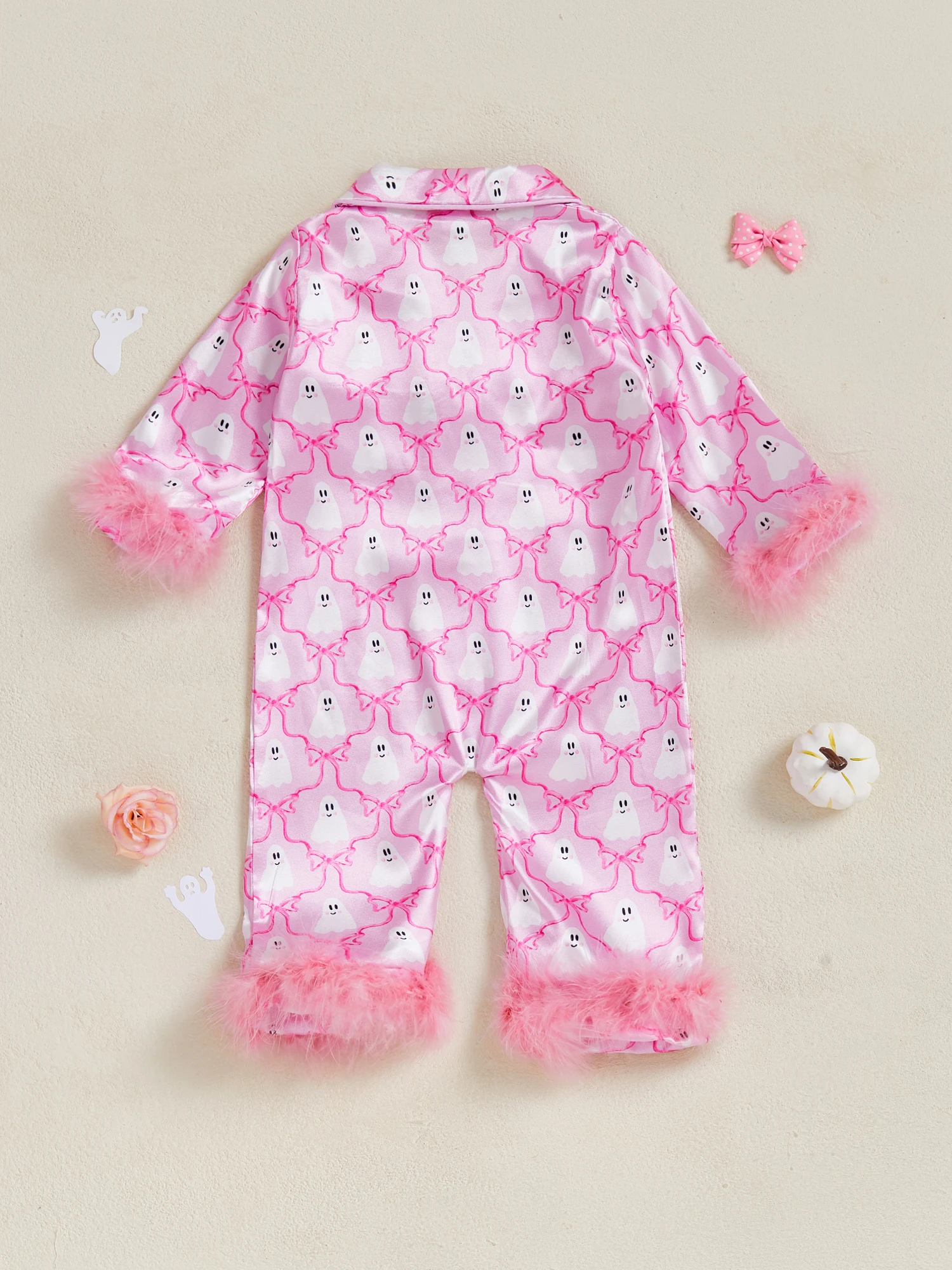 Baby Girls Halloween Pajamas Feather Cuffs Pumpkin/Ghost Print Button up Long Sleeves Jumpsuit for Loungewear Sleepwear