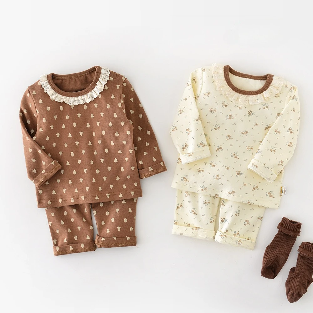 2025 New Autumn Baby Pajamas Sets 0-3T Cute Floral Lace O-Neck Kids Sleepwear Baby Girls Cotton Homewear