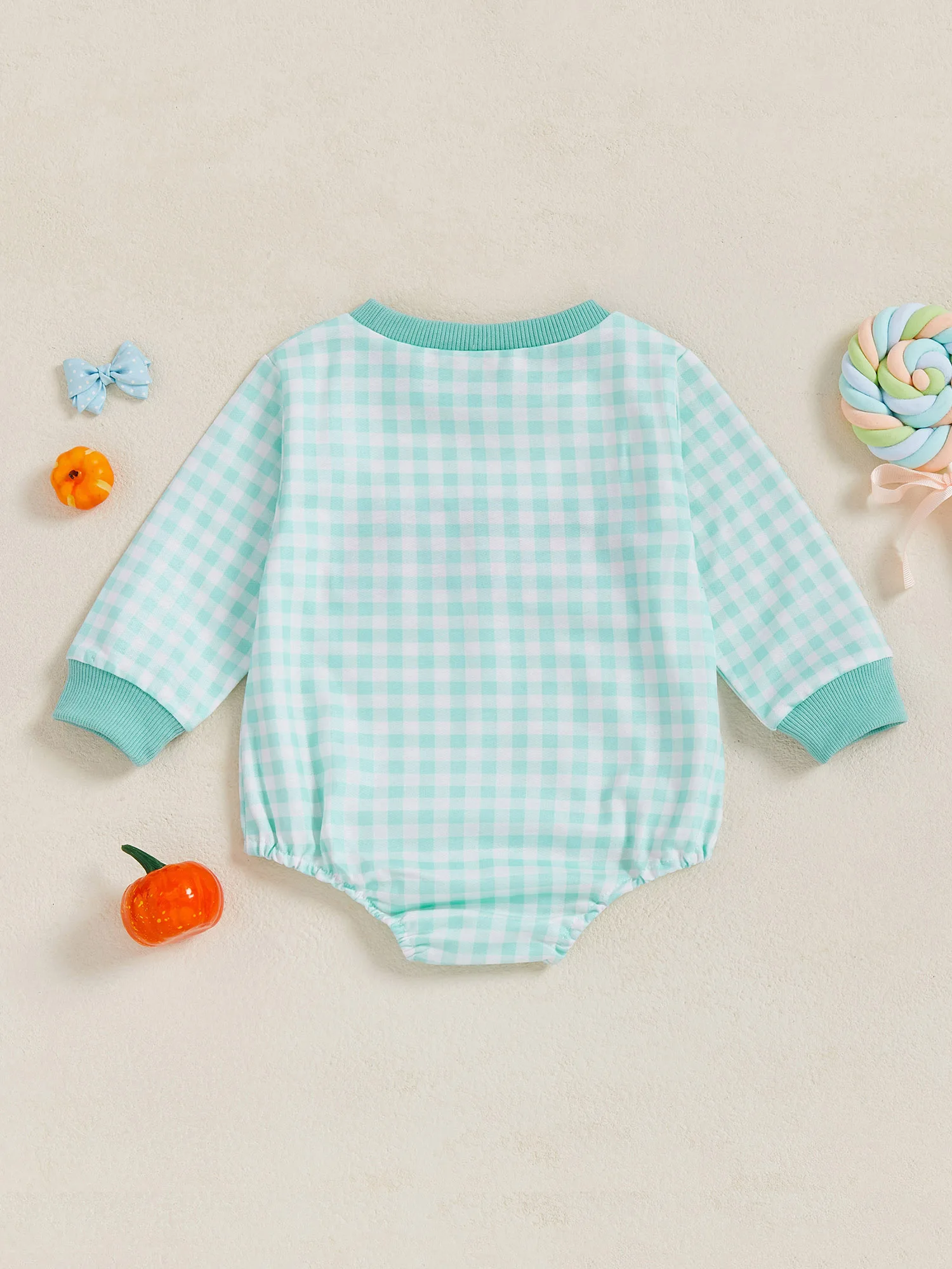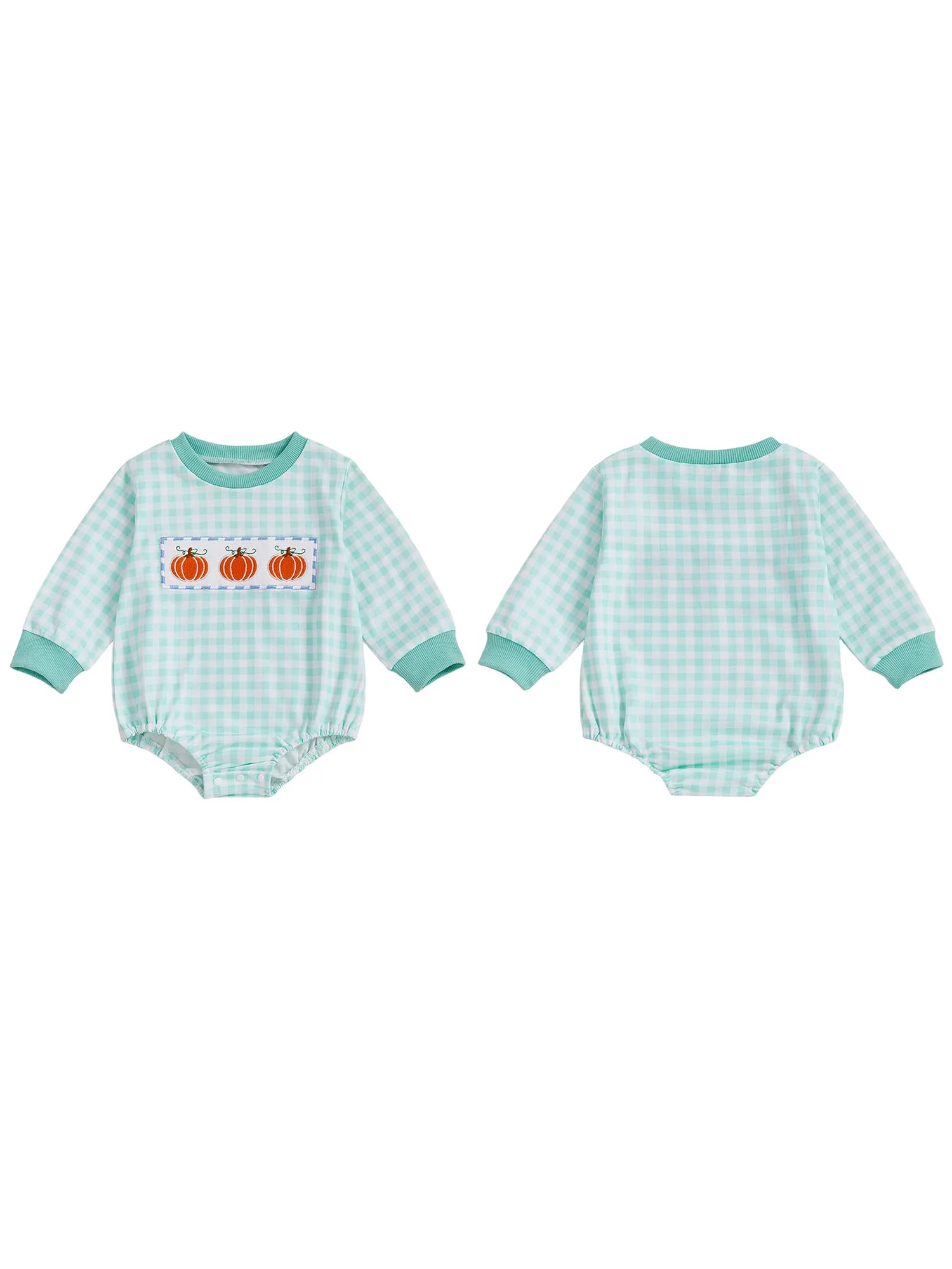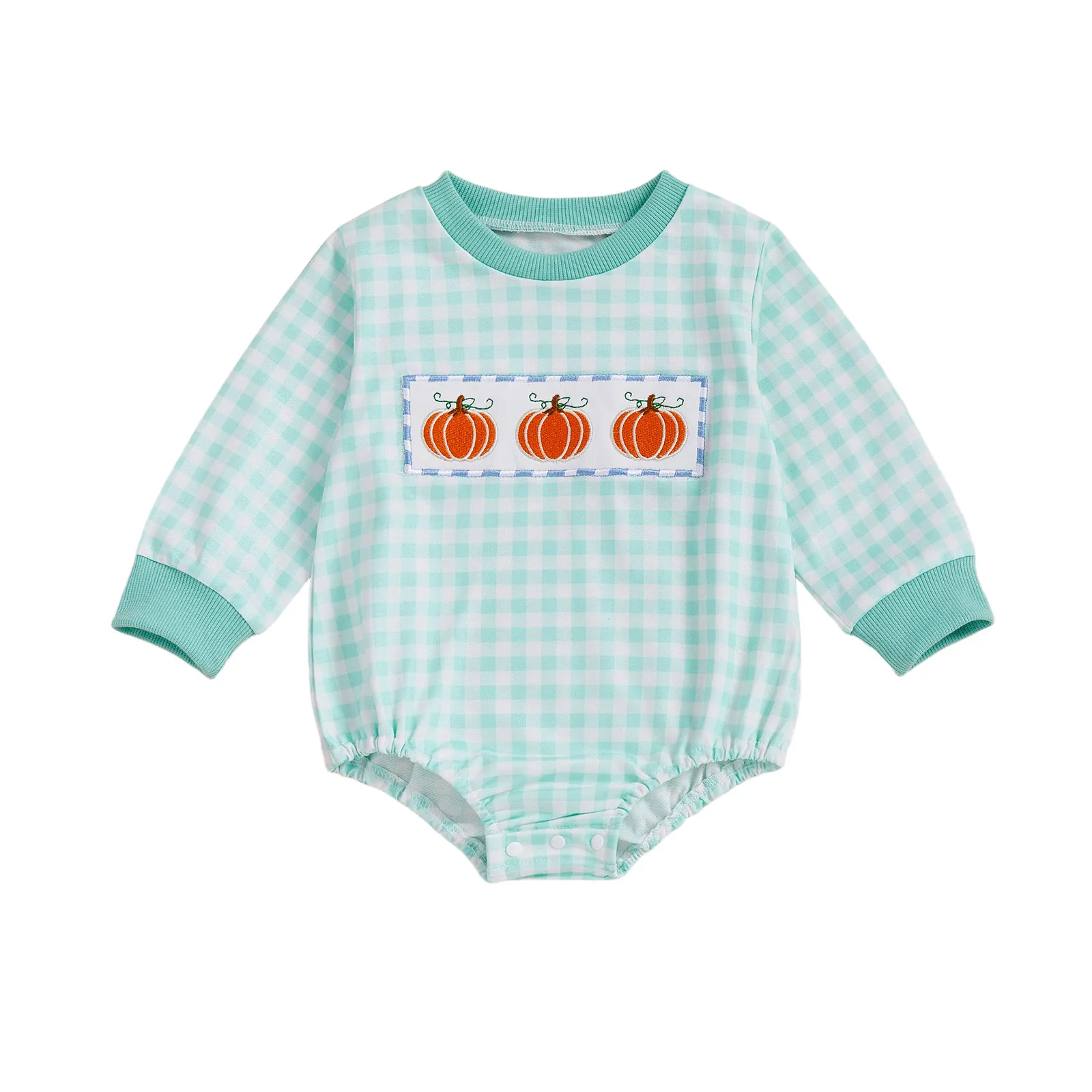 Baby boy long sleeve romper with pumpkin embroidery, plaid print, round neckline, long sleeves and crotch snap closure; Make your baby more attractive when wearing it