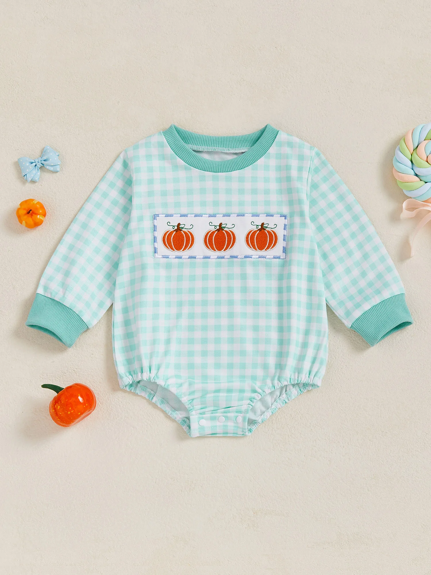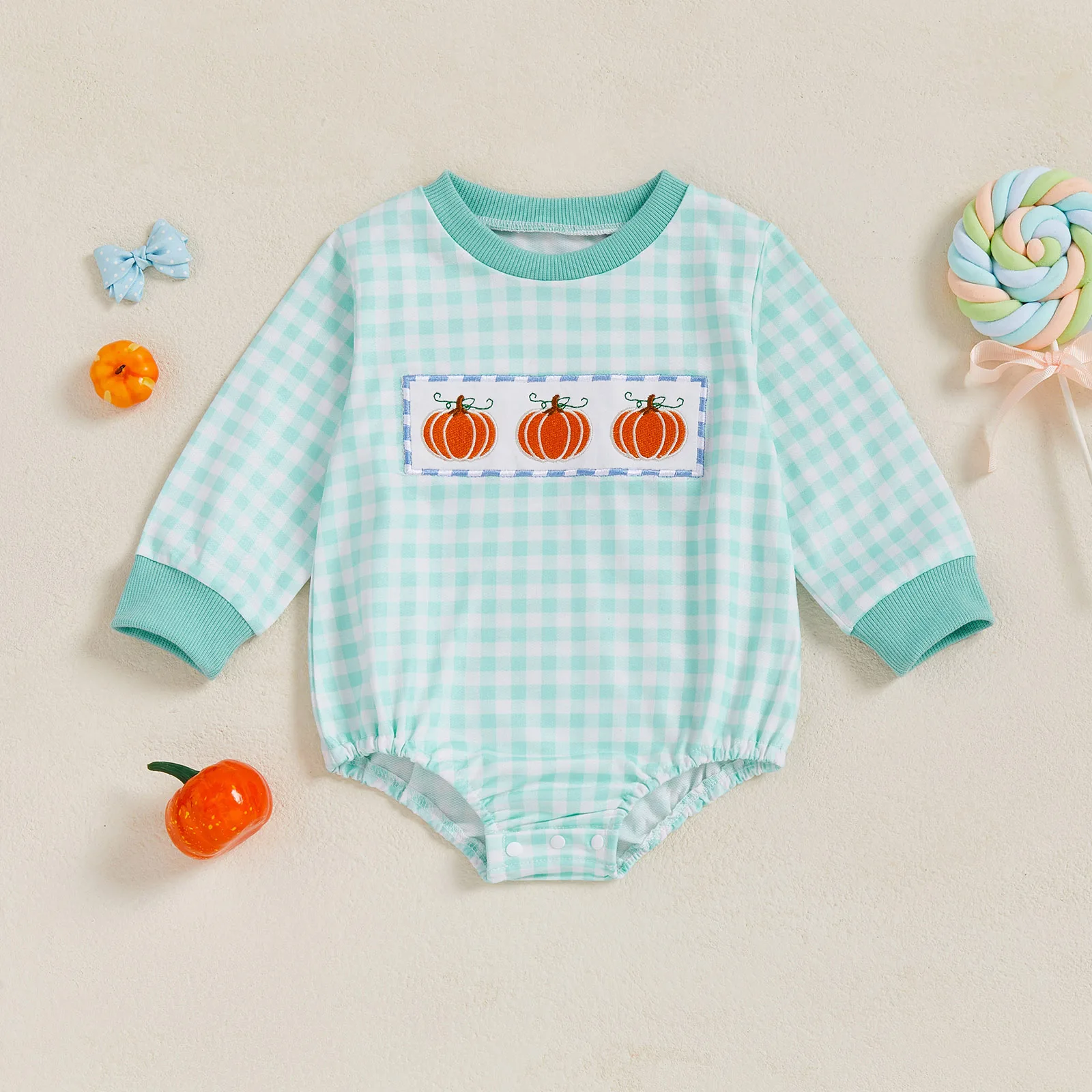 Baby Boy Plaid Sweatshirt Romper Casual Pumpkin Embroidery Long Sleeve Jumpsuit for Infant Toddler Cute Outfit