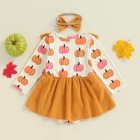 Baby Girls Halloween Romper Dress Flying Sleeve O Neck Pumpkin Print Romper with Headband