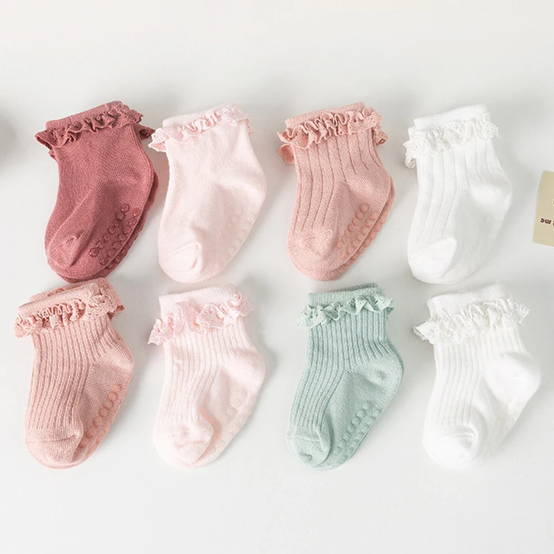 Cute Lace Ruffle Baby Socks Soft Kids Girls Short Socks With Rubber Soles Anti Slip Solid Color Infant Toddler Floor Socks
