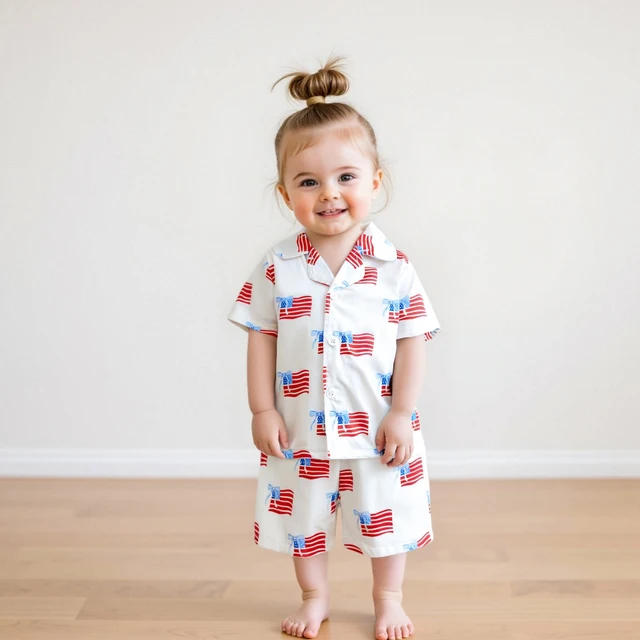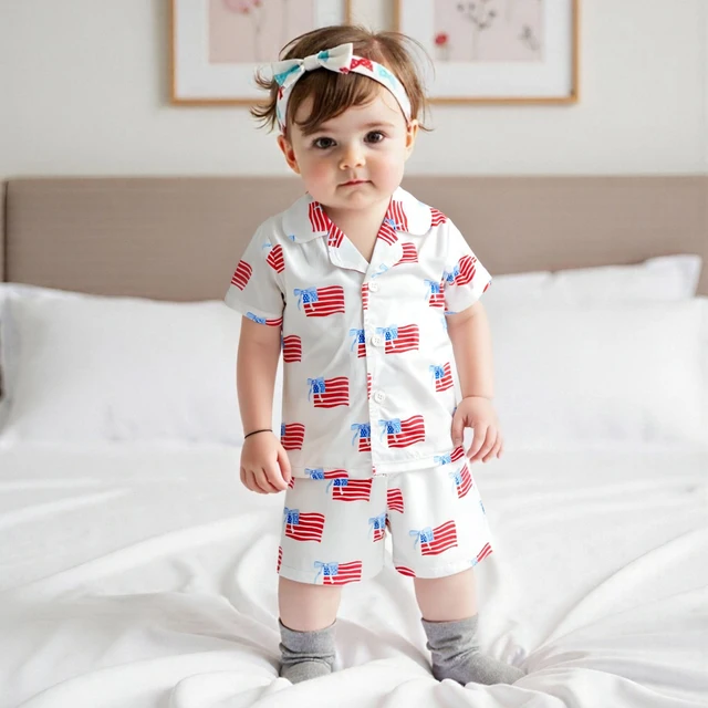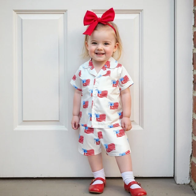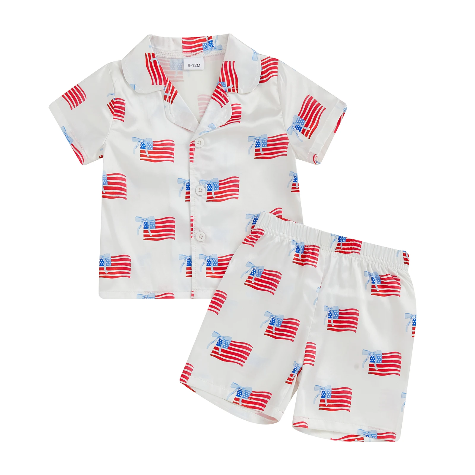 Toddler summer pajamas with bow flag print; Girls pajama shirt with short sleeves, lapel collar and front button closure; Pajama shorts with elastic waist, easy to fit, simple and stylish, warm and cozy