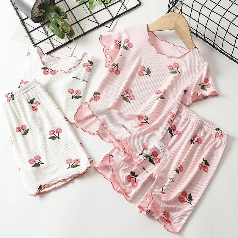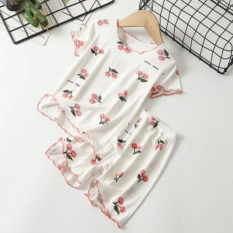 Girls Summer Pajama Set Cherry Blossom Print 4-Way Stretch Shorts & Tee Breathable Modal Blend for Bedtime and Playtime for 1-8Y