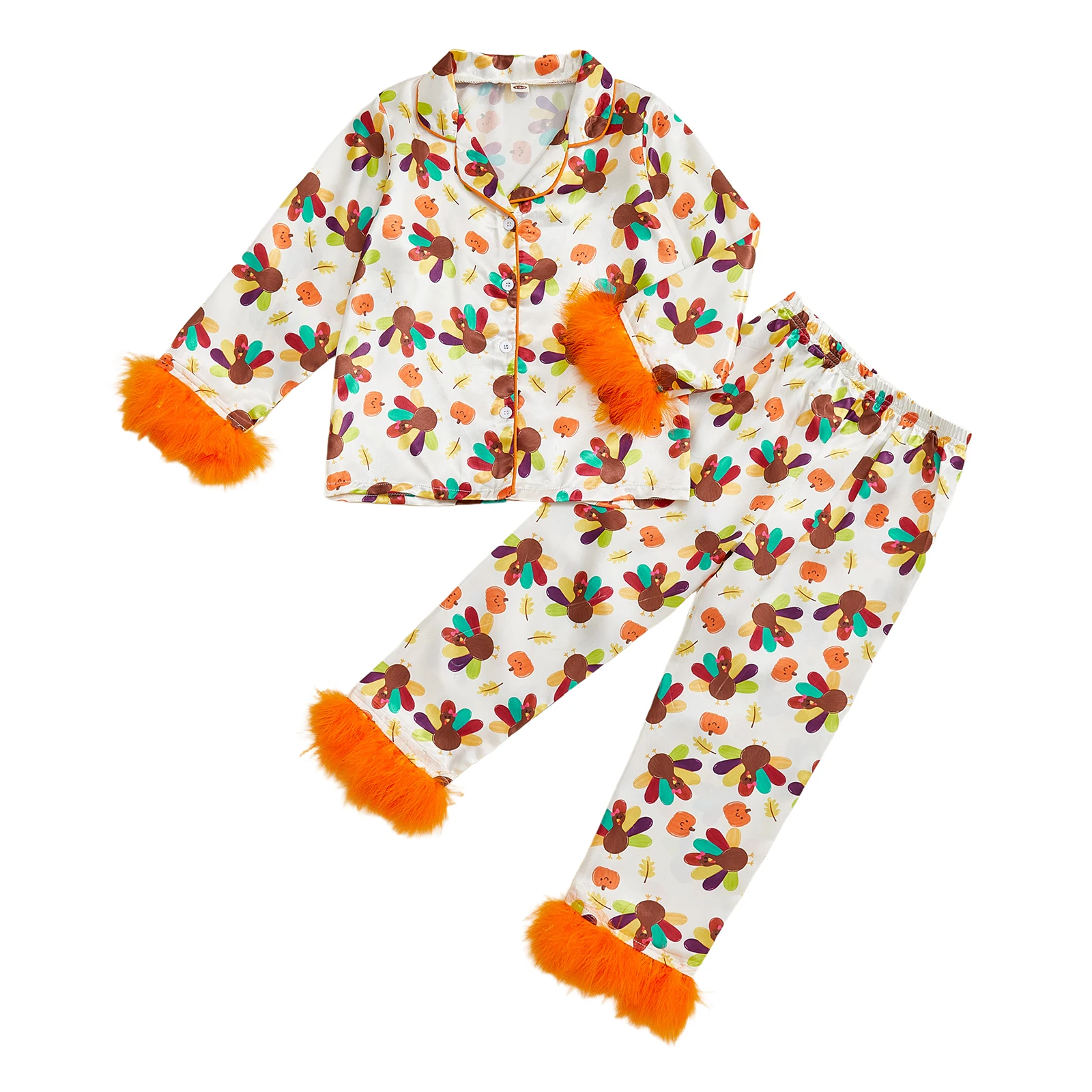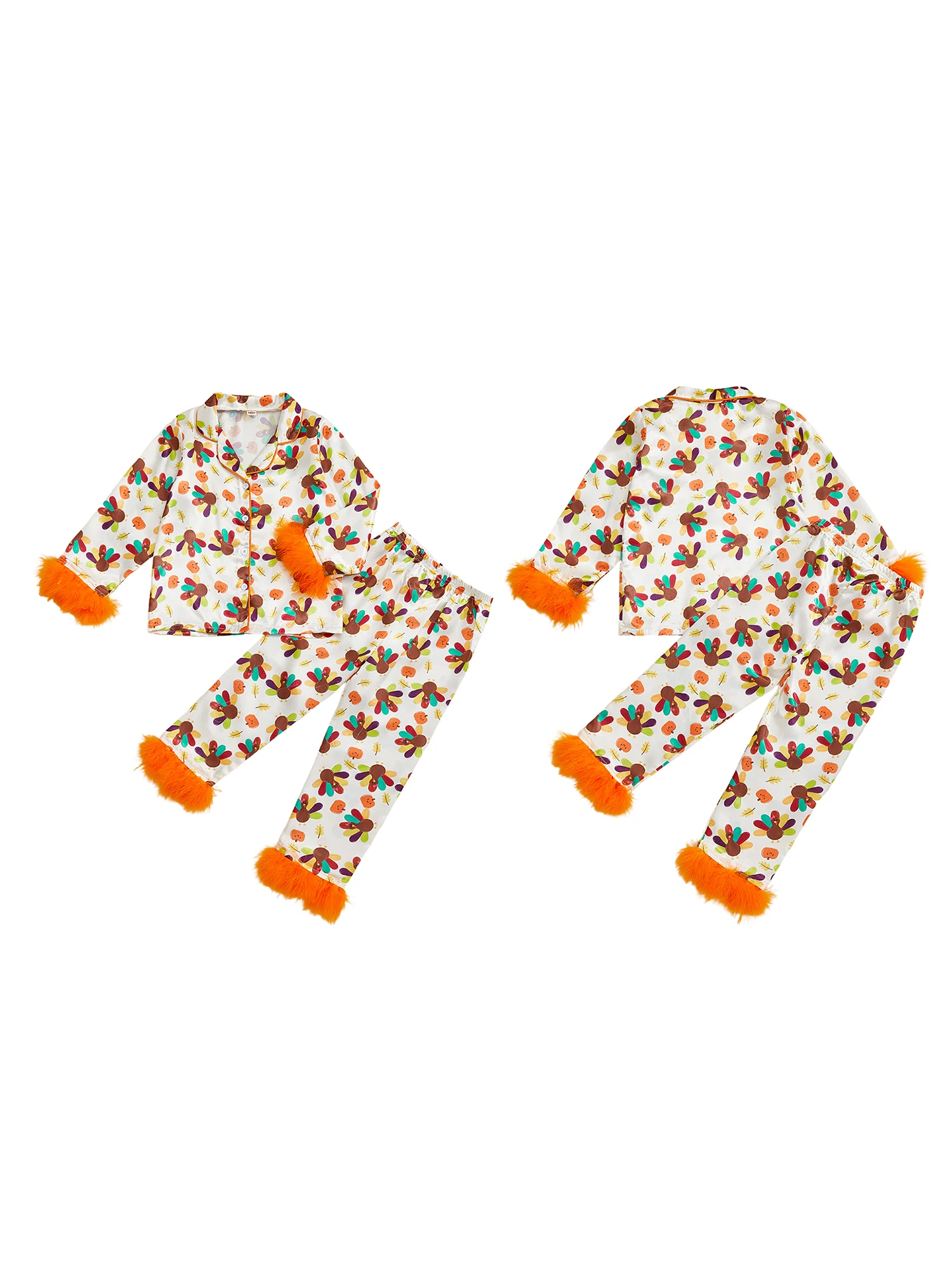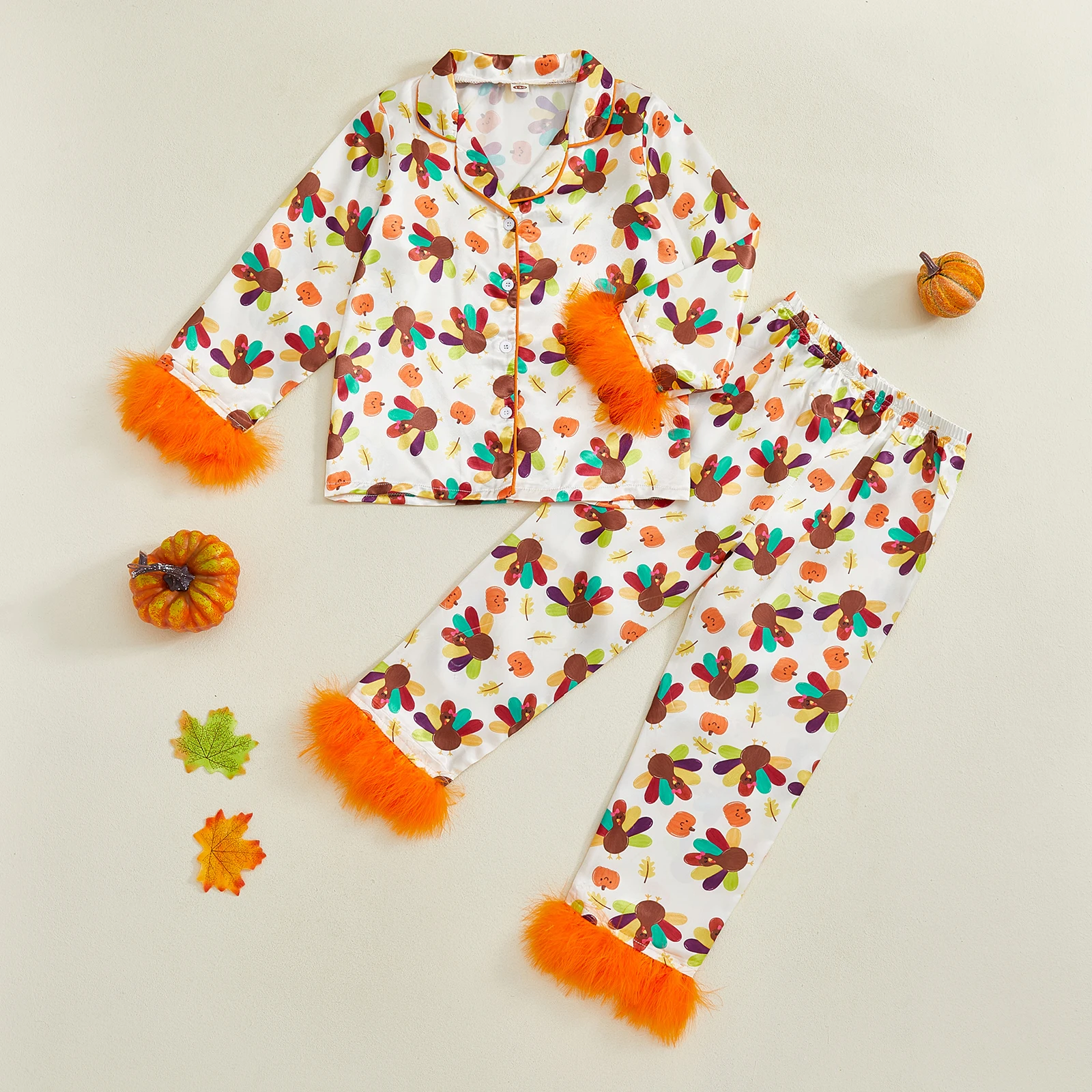 Girls Thanksgiving Pajamas Set Long Sleeve Turkey Print Fur Cuffs Tops and Pants Set Sleepwear