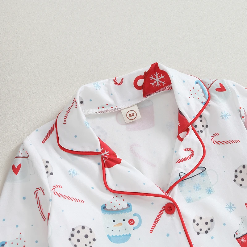 Christmas pajamas for kids with trendy prints and unisex design, very cute. Baby pajama top features long sleeves, button closure and lapel collar for easy on and off. The elastic waist of the pants ensures a snug fit, making it a cute and comfy sleepwear.