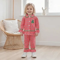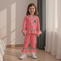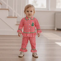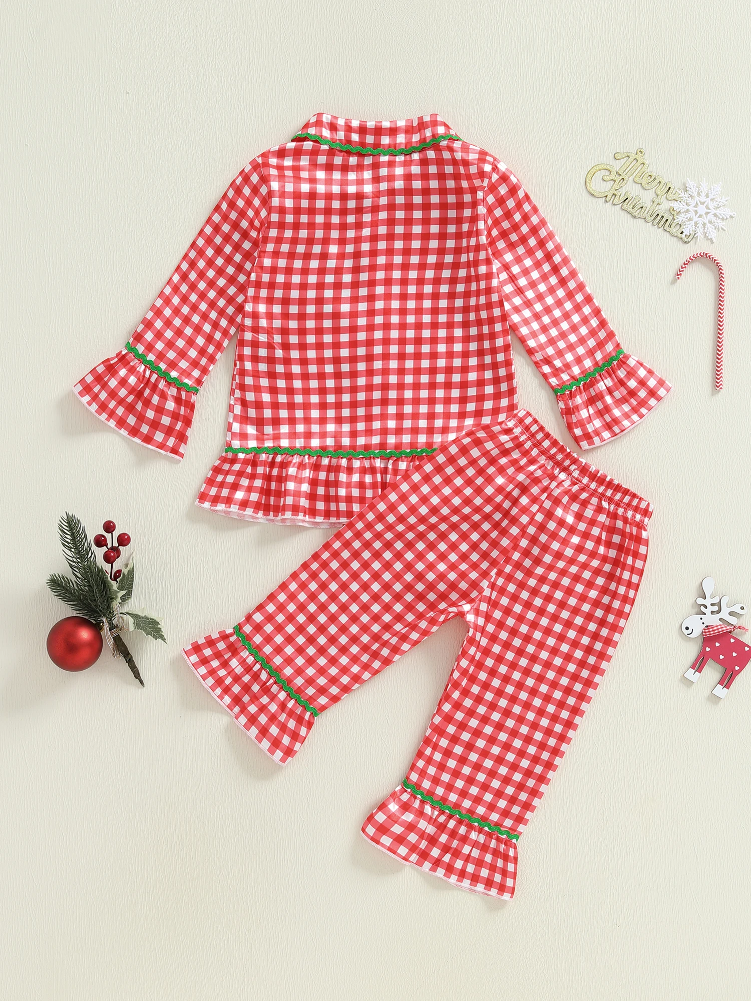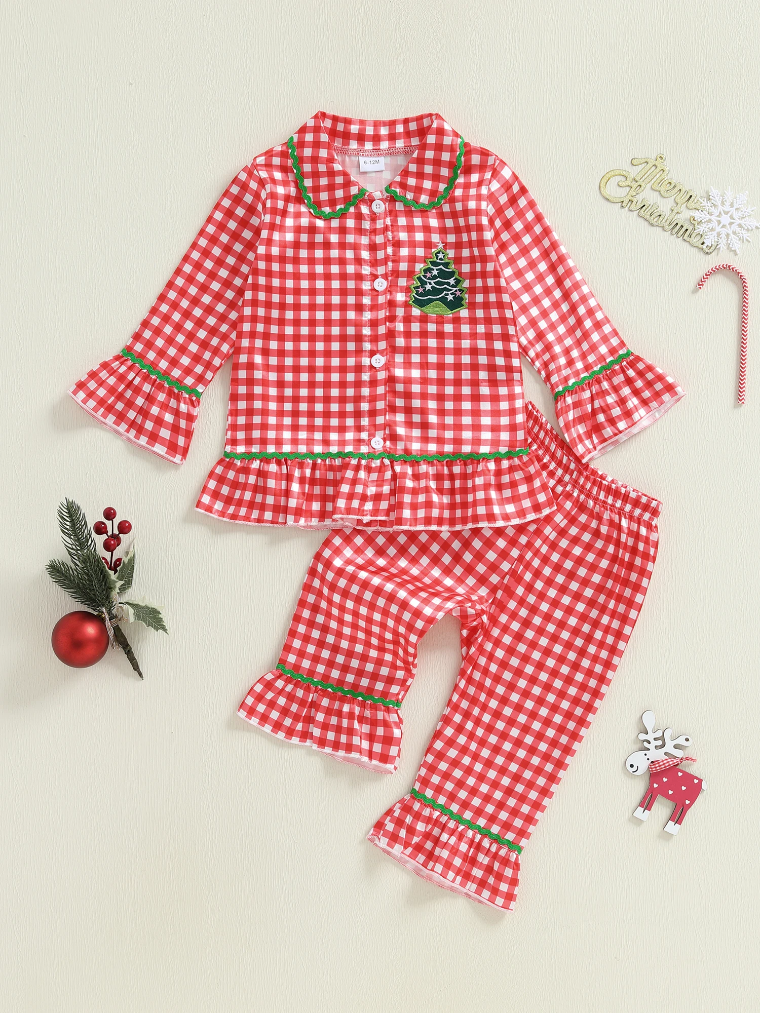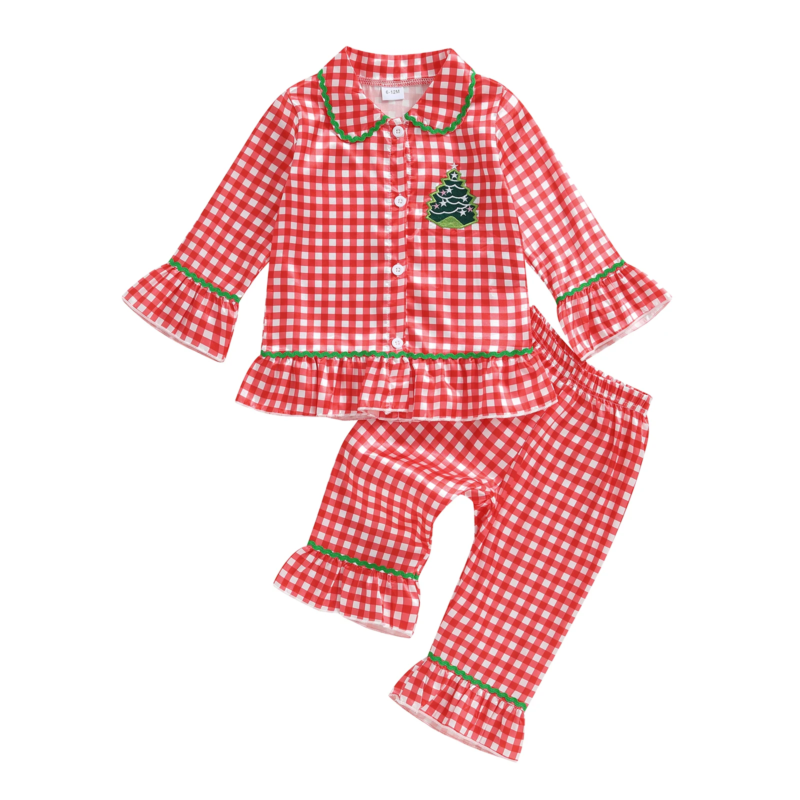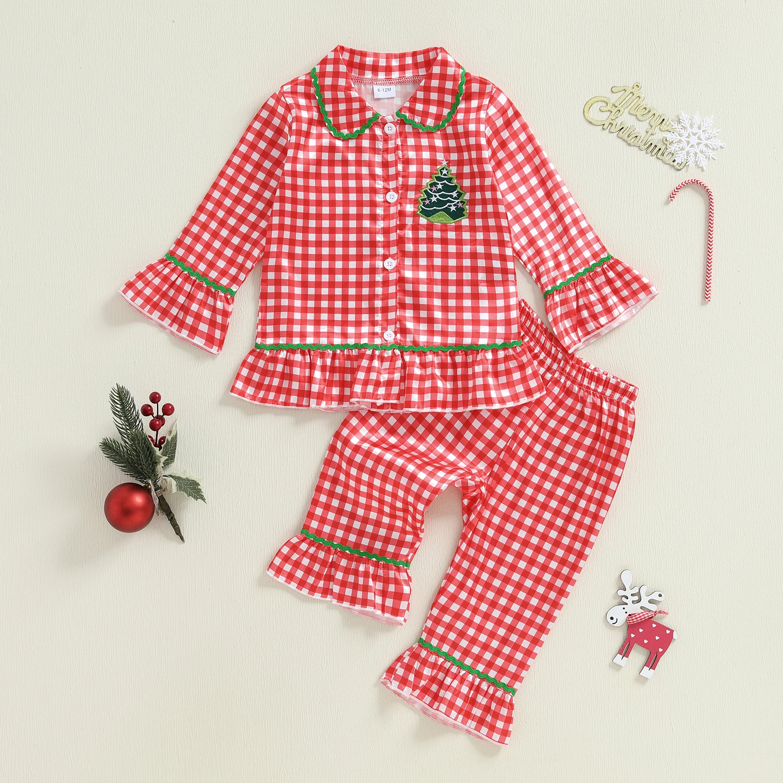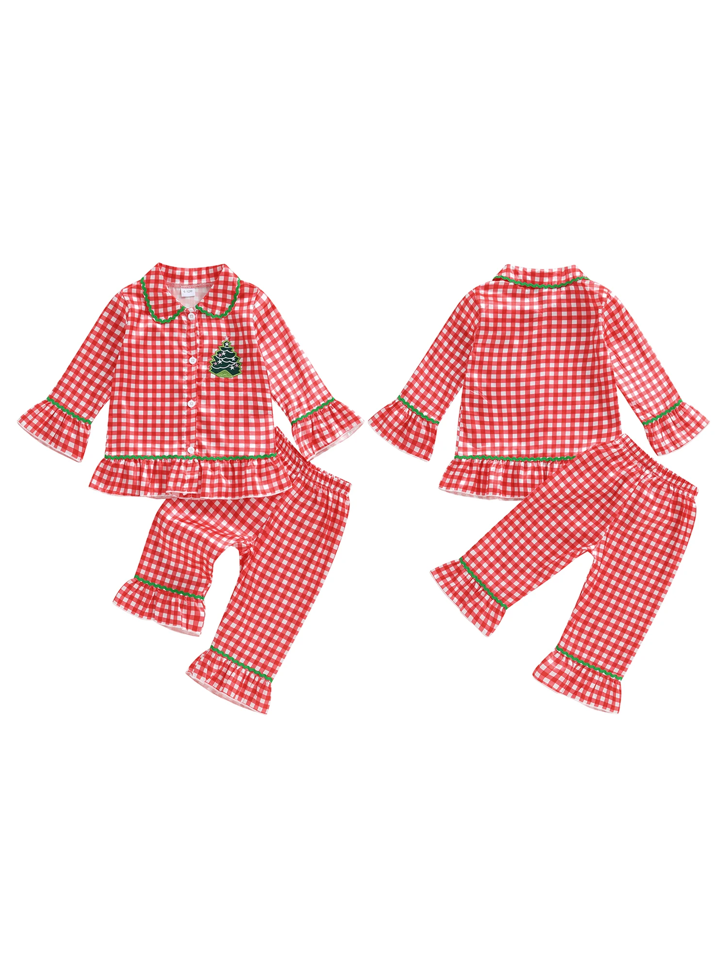 Little Girl Christmas Plaid Pajama Set Tree Embroidered Long Sleeve Ruffle Tops and Elastic Waist Pants 2 Piece Sleepwear Outfit