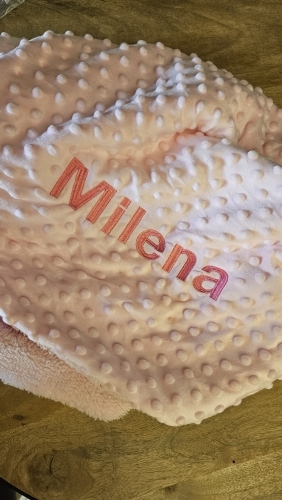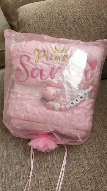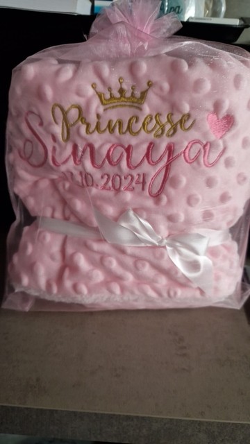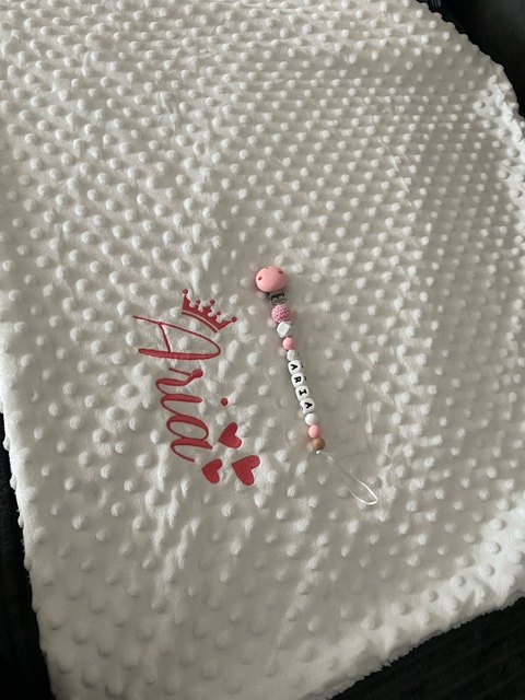 A fluffy blanket, beautifully stitched with a name. The pacifier bracelet is also very good in quality.