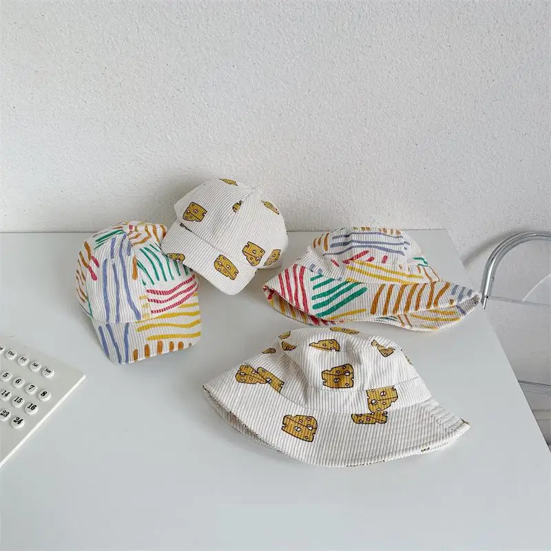 Spring Autumn Boy Children Corduroy Colorful Striped Baseball Cap Girl Baby Cheese Print Peaked Hat Kid Cotton Casual Bucket Hat