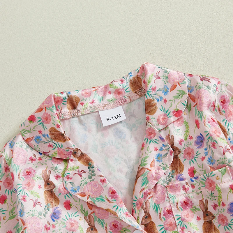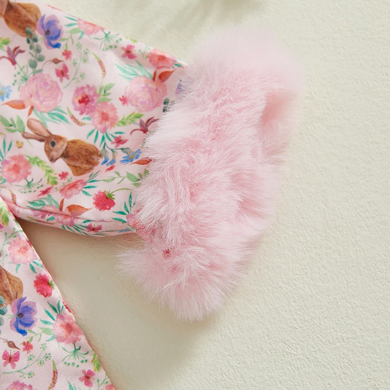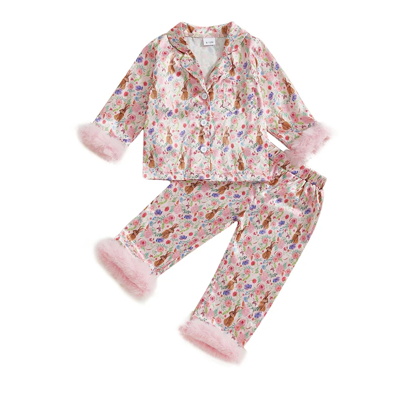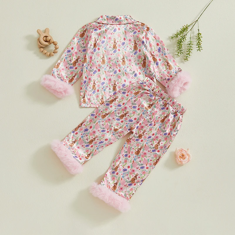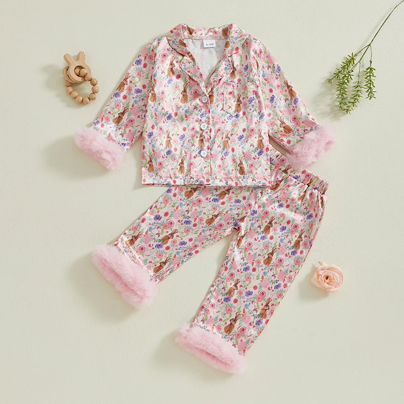 Toddler Girl Button Down Pajamas Set Cute Bow Rabbit Print Feather Trim Long Sleeve Sleep Shirt + Pants Set Girls Fall Pjs