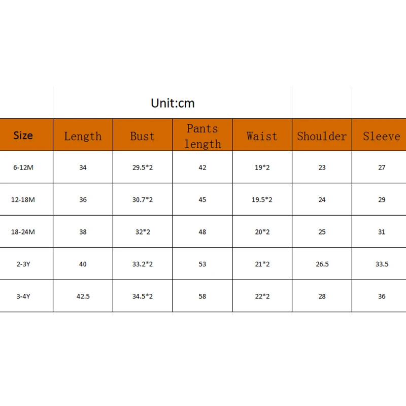 6-12M Tops Length: 34 Bust: 59 Sleeve: 27 Shoulder: 23 Pants Length: 42 Waist: 38 Advised Age: 6-12 Months