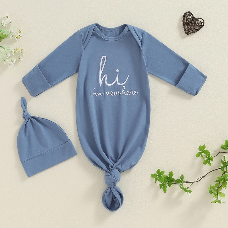 Baby sleep sack with letter embroidery, crew neck, long sleeves, and beanie hat set, lightweight and warm fabric keeps baby warm while still preventing overheating.